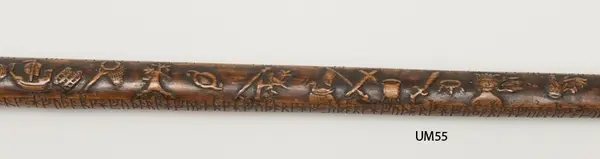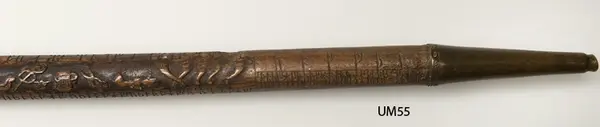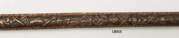 En runstaf med elfenbernskrycka och upphöjda figurer.