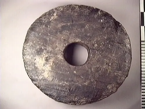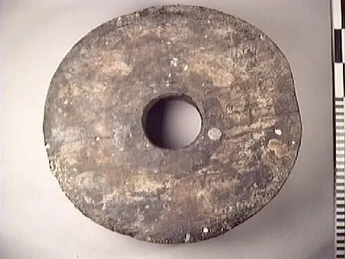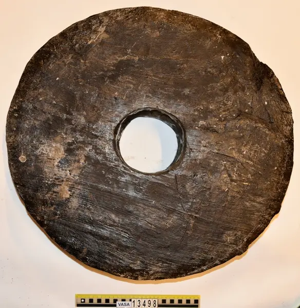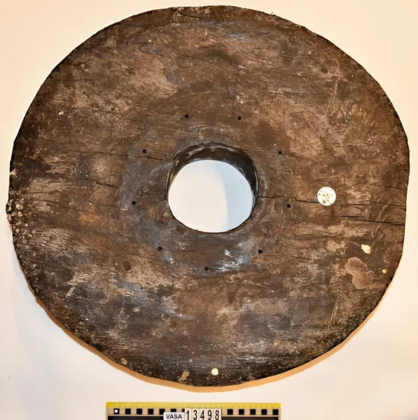 The truck is the wheel on which the gun carriage rolls. It is a solid wooden disk , sometimes with the edges lightly chamfered, with a circular hoel for the axletree in the centre. The hole is reinforced by an iron ring nailed to the outer face of the truck. In some cases, the truck is made of two pieces of wood, a thicker disk with a thinner disk nailed to its outer face. These may be trucks for lighter guns adapted to heavier carriages by increasing the thickness. All of Vasa’s gun carriages were built for four trucks on two axletrees.