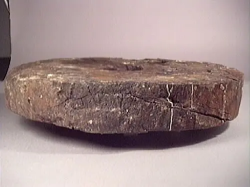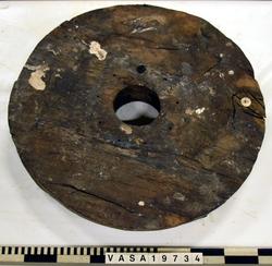 The truck is the wheel on which the gun carriage rolls. It is a solid wooden disk , sometimes with the edges lightly chamfered, with a circular hoel for the axletree in the centre. The hole is reinforced by an iron ring nailed to the outer face of the truck. In some cases, the truck is made of two pieces of wood, a thicker disk with a thinner disk nailed to its outer face. These may be trucks for lighter guns adapted to heavier carriages by increasing the thickness. All of Vasa’s gun carriages were built for four trucks on two axletrees.
