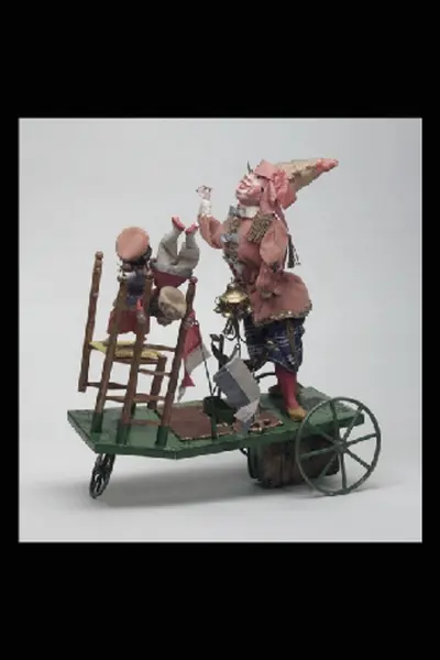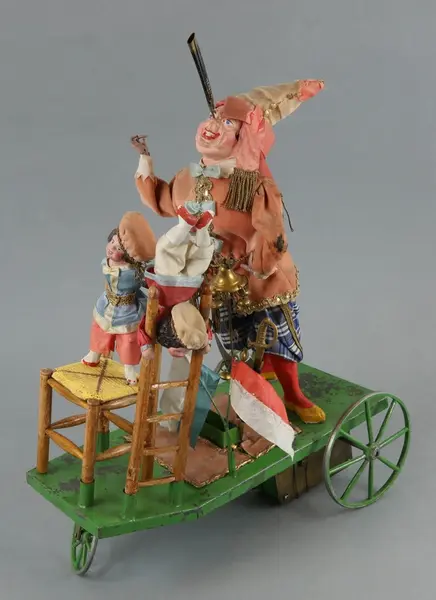 a+) Equilibriste à Mécanique (mekanisk balanskonstnär) bestående av clown av massa (papier maché?), med rosa sammetsjacka och blårutiga byxor, stående på grönlackerad vagn av metall med tre hjul. På näsan har clownen fäste (spets) på vilken kan fästas. På vagnen olika fästen (bl a två svärdsskidor) för olika lösa attiraljer: Stege med docka i röd sidenjacka och beige huvudbonad, stol (delar saknas) av trä med gul sits och stående på sitsen liten docka med blå jacka, tvådelad flaggstång med grön/vit och röd/vit tvåuddiga flaggor, metallten med klocka och halvmåne i gulmetall med bjällor, Svärd av gulmetall (har ursprungligen trol. funnits två svärd)