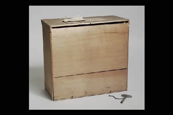 c+) Originalförpackning, enkel, av obehandlat trä, Stor lucka framtill, lock ovanpå. Enligt äldre kat.kort skall det ursprungligen ha suttit ett reklamkort på locket, vilket det nu bara finns rester kvar av.Har tillhört brukspatron Edv. Otto Benedicks (1818-1872), Gysinge, Gästrikland.