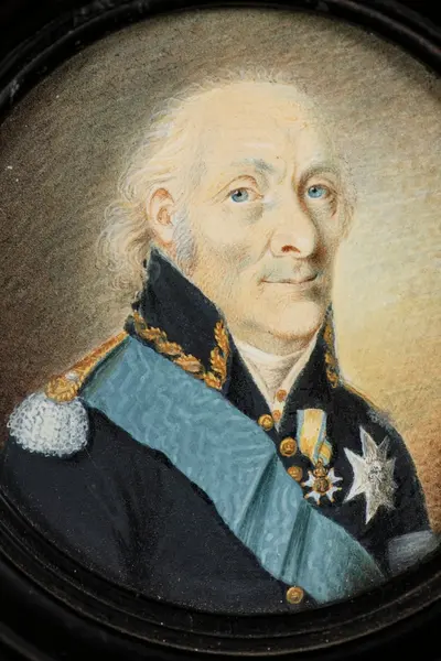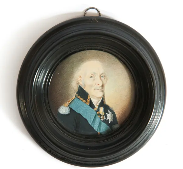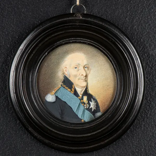 Porträtt i miniatyr på elfenben av skeppsbyggmästaren och varvsamiralen Fredrik Henrik af Chapman iförd uniform med ordnar.