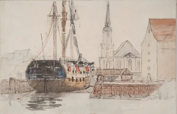 Subject Framsida: Hamnbild, i förgrunden th en kaj, med korsvis sammansatt kajklädning. På kajen magasinshus, vid kajhörnet går en bassäng in, i denna ett skepp med nedriggade rår. Skeppet ses snett akterifrån, rösten och jungfrur med taljerep angivna i röd färg, i bakgrunden en kyrka med en kampanil.