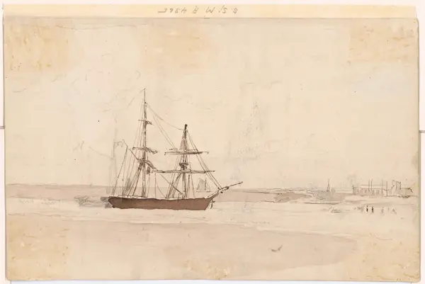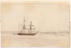 Frånsida; En brigg med nedtagen fockbramstång och beslagna segel liggande i en till synes kanal, visande st.b. sida.