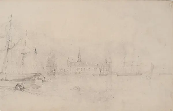 Framsida: Helsingörs redd med Kronborgs slott i bakgrunden, tv i bildkanten en galeas, förskeppet ej medtaget. Längre in mot stranden ett råriggat segelfartyg sett förifrån, framfö...
