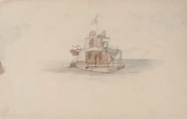 Frånsida: En monitor, sedd förifrån, Svensk flagg med unionsmärke, blåser från masten.