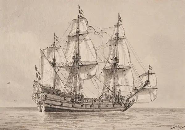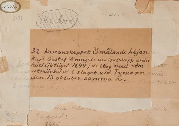 "32-kanonskeppet Smålands Lejon. Karl Gustaf Wrangels amiralskepp under höstsjötåget 1644; deltog med stor utmärkelse i slaget vid Femern den 13 oktober samma år".