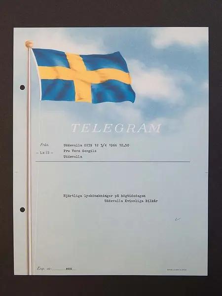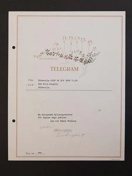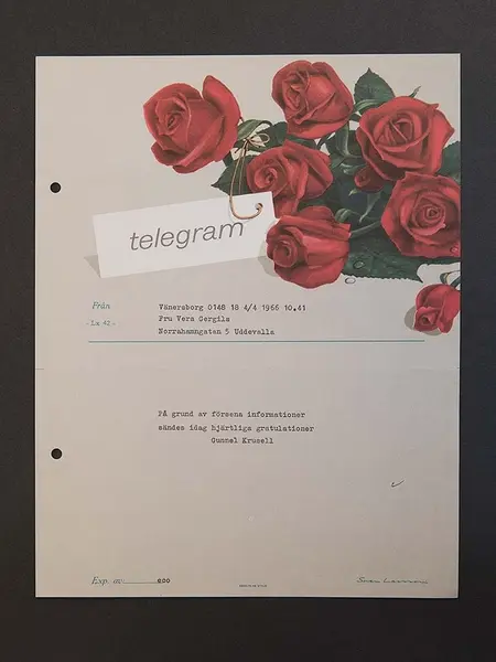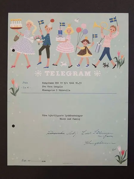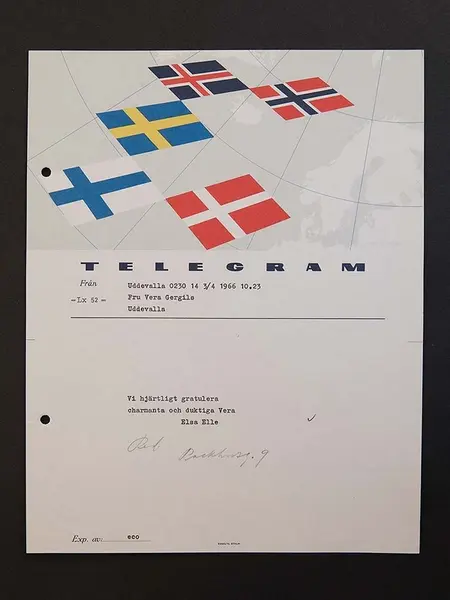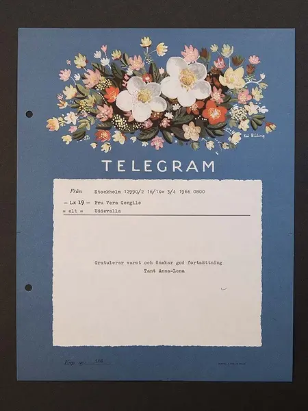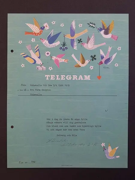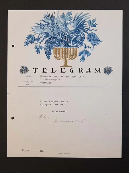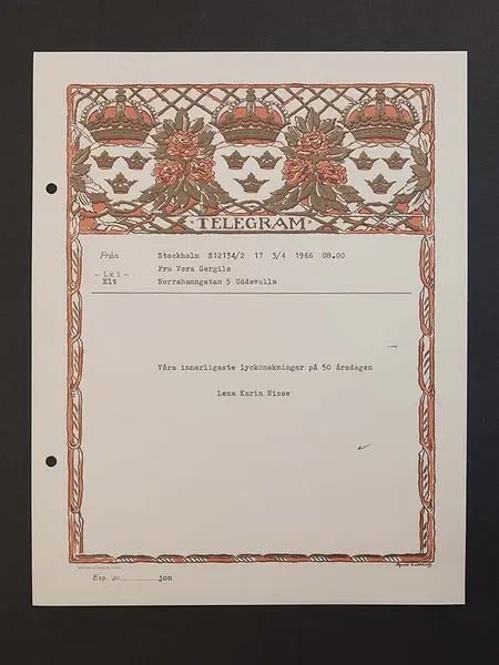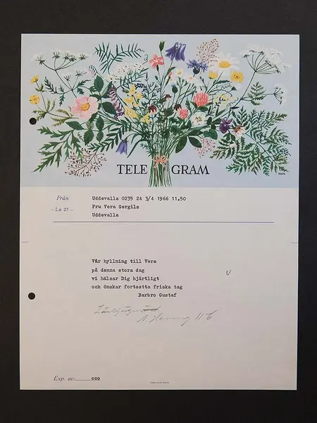 - 13 födelsedagstelegram av olika utforning sända till födelsedagsbarnet Vera Gergils i Uddevalla, 50 år den 3 april 1966.