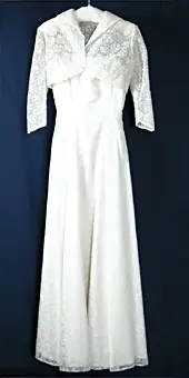 1) Vit brudklänning i två lager, 1959. Underklänning av taftsiden, överklänning av spetsliknande konstmaterial. Mycket vid, smala axelband, rak urringning med två sprund. Långt (350 mm) blixtlås i ryggen. Breda veck fram- och baksidan. Hårda fjädrar (6 st) i sömmarna.