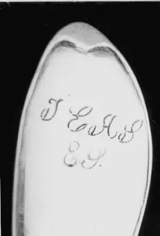 Skedar, 12 stycken. Silverskedar av närmast gammalsvensk modell tillverkade av Carl Gustaf Holmberg, mästare i Nora 1796-1820. Märkta med ägareinitialer på skaftets baksida: JEAS o...