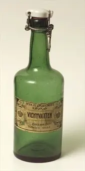 Flaska med patentkork av grönt glas; cylinderformad med avsmalnande "hals" och mot mynningen vulst. På denna sitter patentkork av vitt porslin med gummiring, fäst i en stålbygel runt halsen. Botten svagt upphöjd mot centrum. Avlång, beigegul etikett med text: NYA BRYGGERIET KRONAN ÖrebroMellan två parallella steck står: VICHYVATTEN. Strecken övergår åt vardera sidan i kartuscher med smala ringar och en krona. På tvären står: FÖRVARAS LIGGANDE. Gåva av fru Margit Hagenfeldt-Engdahl, StockholmKommer från föräldrahemmet i Örebro, grosshandlare A H Israelsson, ÖrebroNeg.nr.2019/69Anmärkning/värde/placering: Gåva av Fru Marigt Hagenfeldt-Engdahl, Nytorgsgatan 15, Stockholm.Kommer från föräldrarhemmet i Örebro grosshandlare A H Israelsson, Olaigatan 44, Örebro