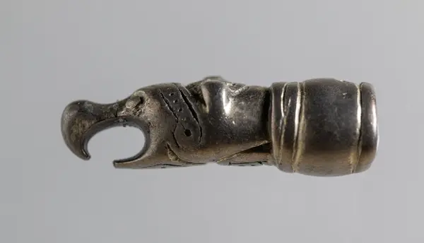Ändbeslag till kedja eller dylikt, i form av djurhuvud, silver, med spår av förgyllning, nospartiet genomnött, i kanten av den holkformiga fördjupningen två motsatta nithål.Publ.: Från Bergslag och Bondebygd 1956. G. Ekelund: Silverskatten från EketorpM. Stenberger, 1964. Det forntida Sverige.Utställt på Länsmuseet, Klenodkammaren 18/6 2000.Digital bild finns på CD 8 och 9.