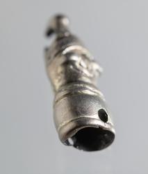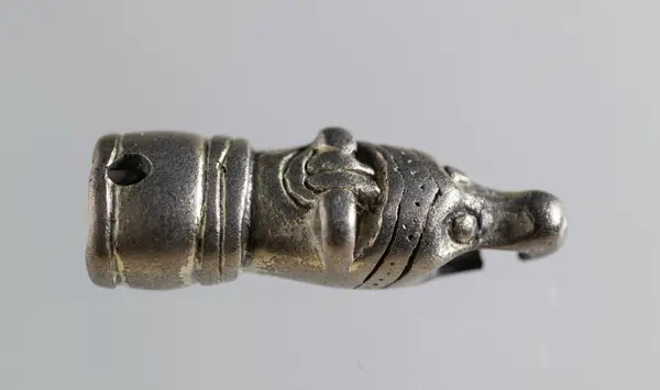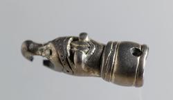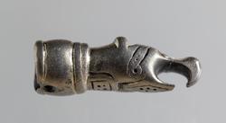 Ändbeslag till kedja eller dylikt, i form av djurhuvud, silver, med spår av förgyllning, nospartiet genomnött, i kanten av den holkformiga fördjupningen två motsatta nithål.Publ.: ...