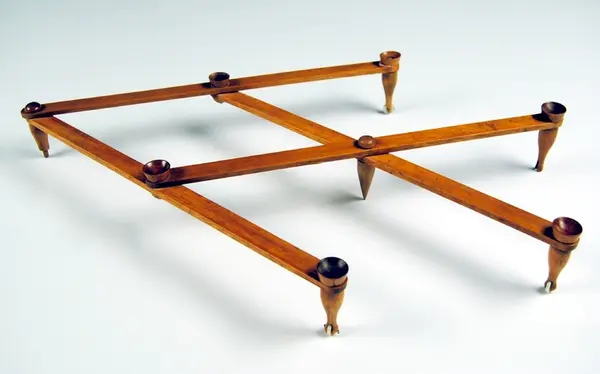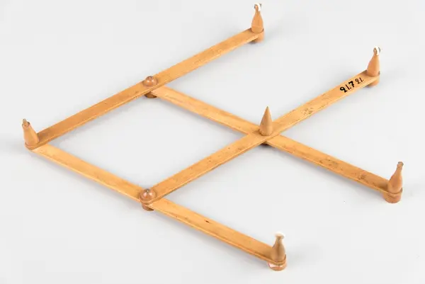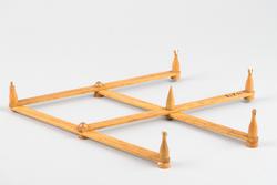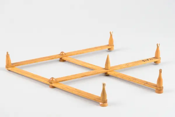 Psykograf bestående av 4 sammanfogade stavar av björk. På översidan 6 skålar av trä för fingertopparna.