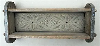 Ostkar av trä. Ostkaret har rektangulär form. Bottenstycket samt sidogavlarna är intappade i ändgavlarna. Sidogavlarnas tappar är förlängda samt reglade med två träsprintar i respektive tapp. Ändgavlarnas har avrundade hörn och är förstärkta med runt om löpande järnband. Bottenstycket är dekorerat med två blommor i karvsnitt med vardera sex kronblad. Två av kronbladen på respektive blomma är utdragna mot bottenstyckets korsidor samt två mot dess mitt så att blommorna möts. Det ruterformade partier mellan blommorna, i centrum av bottenstycket, är dekorerat med uddsnitt. Ytan mellan kronbladen mot bottenstyckets båda kortsidor är likaså dekorerade med uddsnitt. Bottenstyckets dekor omges av en ram bestående av enkla uddsnitt. Denna ram är längs ena långsidan delvis utplånad. I respektive blommas mitt finns avrinningshål för vasslan.Defekter: Sidogavlarna är spräckta och intappningarna skadade. Sex av träsprintarna i tapparna saknas och har på två ställen ersatts med spikar. Gåva av friherre N G DjurklouNeg.nr.979/66