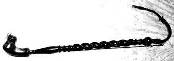 Svarvat skaft i vriden form. Böjbart munstycke av svartbrunt ben. Trasigt böjbart mellanstycke.