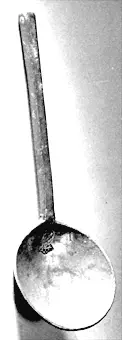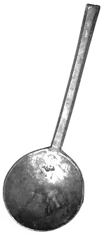 Sked av tenn: med rund bladskål och rakt osmyckat 6-sidig skaft.
