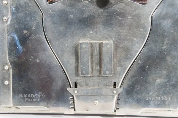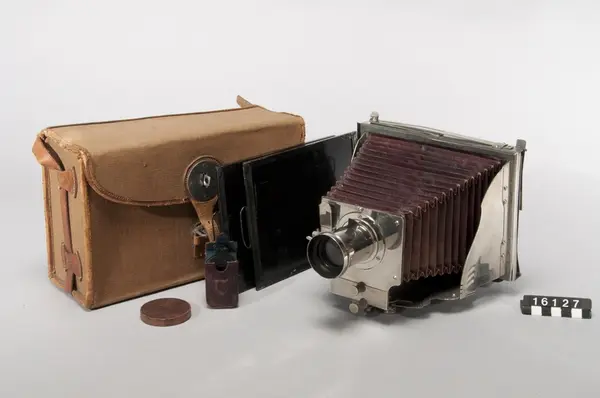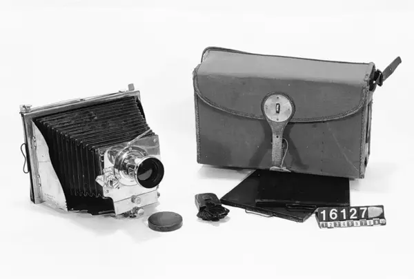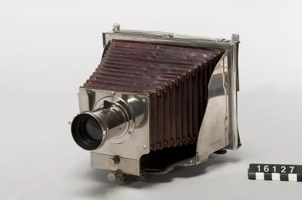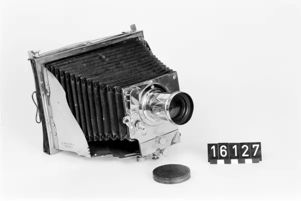 Mader Jnvincibel bälgkamera för plåtar 13 x 18 cm. var den första ihopfällbara metallkameran, modell II. Kameran skänktes till museet i januari 1939.