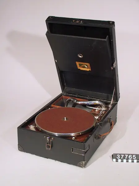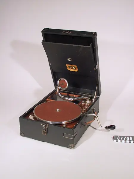 - Den första versionen av His Masters Voice resegrammofon enligt uppgift från givaren. I nköpt i Karlskrona år 1925.
