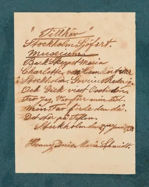 Påförd text: Tillhör Stockholm Sjöfart museium. Bark Skeppet Maria Charlotta vars Hemort var i Stockholm. Govenius Rederig. Och Gick visst Ostindien. Tror Jag, Var förr min tid. Min Far Förde den då. Det står på Taflan. Stockholm den 24de Junii 1938. Henny Doris Maria Schmidt.