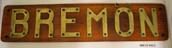 Namnbräda från minsveparen Bremön. Sjösatt 1940 och utrangerad 1966.