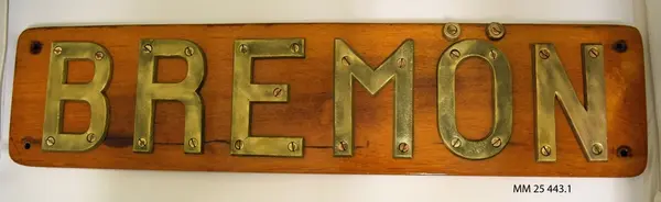 Namnbräda från minsveparen Bremön. Sjösatt 1940 och utrangerad 1966.