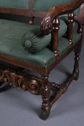 about Treseters sofa med høy rygg. Utskjæringer på rygg, armlener, sofabein og feltene mellom disse. Ryggen er delt i tre felter, mens setet er i et stykke. Feltene og setet er av stoff og festet til treverket med metallnagler. Våpenskjold (byvåpen) i hvert felt over sofaryggen.