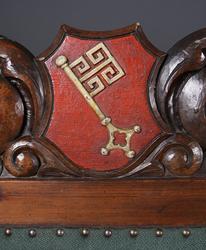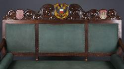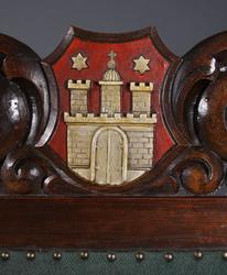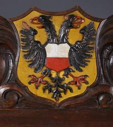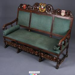 I utskjæringene over tre felter i sofaens rygg er det våpenskjold (byvåpen). Det venstre har en nøkkel, det i midten er Lübecks dobbeltørn, det høyre har en borg med tre tårn og en...