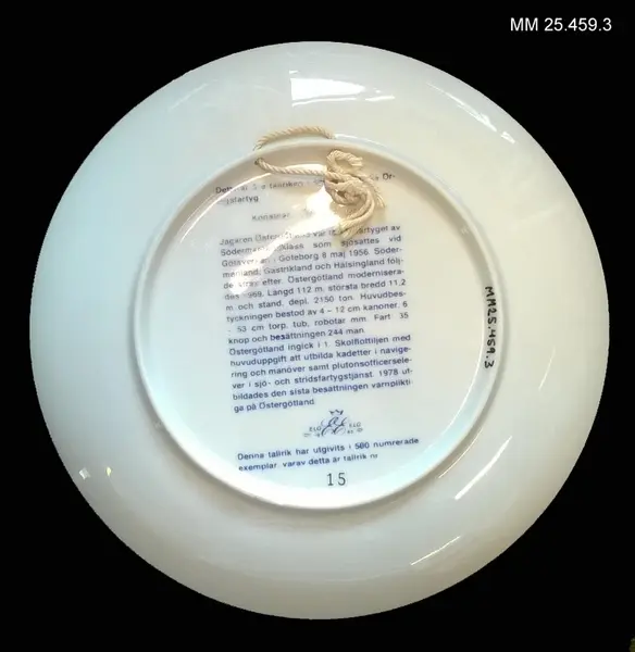 - Samlartallrik från serie med motiv av svenska örlogsfartyg. Denna tallrik gavs ut i 500 numrerade exemplar varav detta är nr 57.