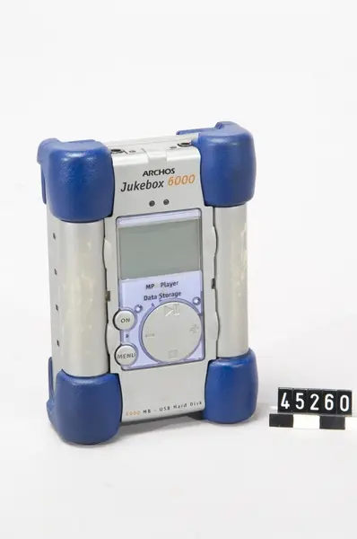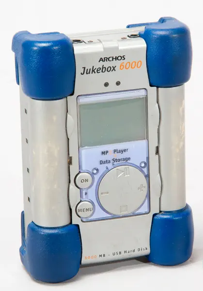 - Mp3-spelare Archos Jukebox var en av de första bärbara mp3-spelarna med inbyggd hårddisk. Den lanserades år 2000. Tillverkaren Archos erbjöd flera typer av tillbehör till datorer, Jukebox kunde också fungera som extern lagringsenhet. Spelaren med namnet Jukebox 6000 distribuerades endast via amazon.com, en portal för handel via Internet. Program för att komprimera musik från CD-skivor så att de kunde lagras på spelaren fanns redan på Internet. Denna spelare är köpt via amazon.com år 2001. Den gick sönder efter fyra år när användarens dotter, då tre år, tappade den i golvet. En av hårddiskspelarens nackdelar är just att den är stötkänslig.