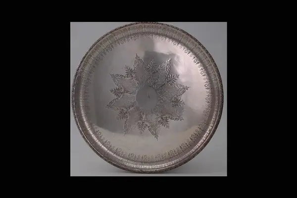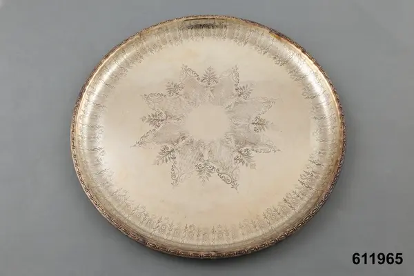 "Bricka, försilvrad metall, rund, med rik ornering. Stämpel saknas. Utländsk/?/.