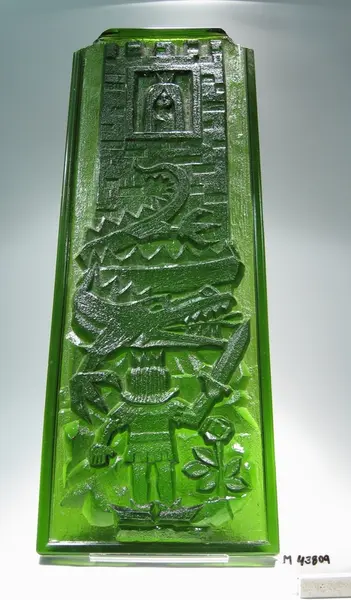 Signerad (John Käll) trärelief finns bevarad i privathem i Älmhult.- TillverkareElme glasbruk (1917 - 1970)