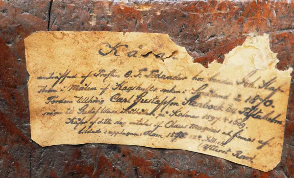 Ur huvudbok: "Har tillhört K. Gustaf Vasas svåger - Ståthållaren på Kalmar, Carl Gustafsson Stenbock till Toftaholm och påträffades av kyrkoherde Tidander år 1871 hos en bonde på Målen i Hagshults sn.