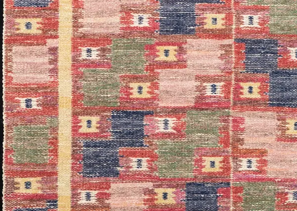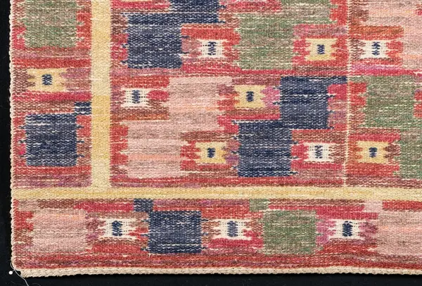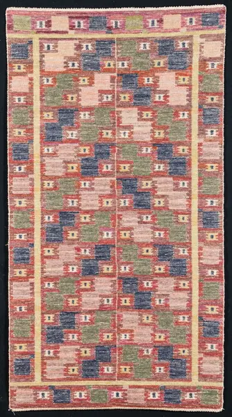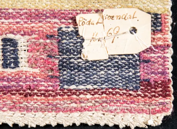 Varp grågult, oblekt lingarn, inslag vitt och grågult, oblekt lingarn, mörkblått, blågrått, blårött, rödblått, mörkt rödblått, ljust gulrött, gröngult, gröngrått, grönt, gulgrönt, gult, rött, ljusrött, grått, rödgrått och ljusbrunt ullgarn, troligen 1 tr, inplock på linnebotten, MMF-teknik. Mittpartiet kvadrater i olika nyanser rött, blått och grönt som är placerade i viggform, inuti en del kvadrater mindre kvadrater i gult eller grågult, oblekt med en blå rektangel i mitten, mittpartiet delas på mitten av en melerad grågul, oblekt/gul rand, runt omkring mittpartiet en fyrkantig bård i gult, ytterst en fyrkantig bård med kvadrater i ljust gulrött, grönt, gulgrönt och mörkblått, däremellan mindre kvadrater i gulgrått, oblekt eller gult med en rektangel i mörkblått i mitten, botten i olika nyanser rött. Vävnaden avslutas med s.k. orientalisk fläta.