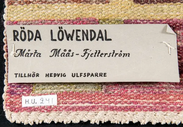 Duk, inplockat mönster, "Röda Lövendal". Röllakan och inplockat mönster. Varp och väft oblekt lingarn. Mönsterformerna i mycket nyanserat rött, i blekrött, blått och grönt. Före 1928.