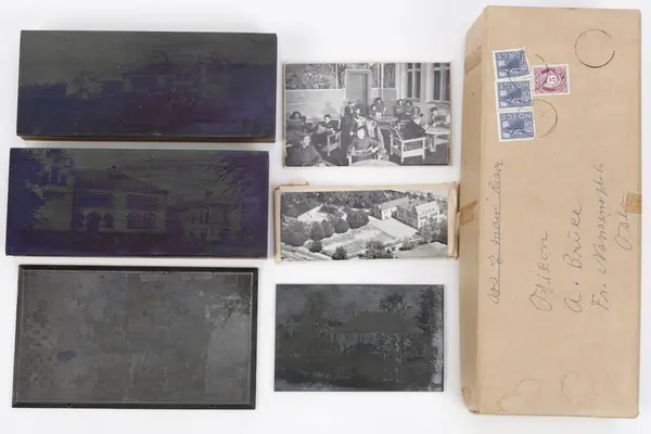 Sekundær, Påskrift (Håndskrevet adresse og avs. "Oticon" er en proddusent av hjelpemidler for hørselhemmede. Dessverre er poststempelet uleleslig, også datering. Esken er brukt senere til oppbevaring av klisjeene.): avs. E Moen (?) Risør