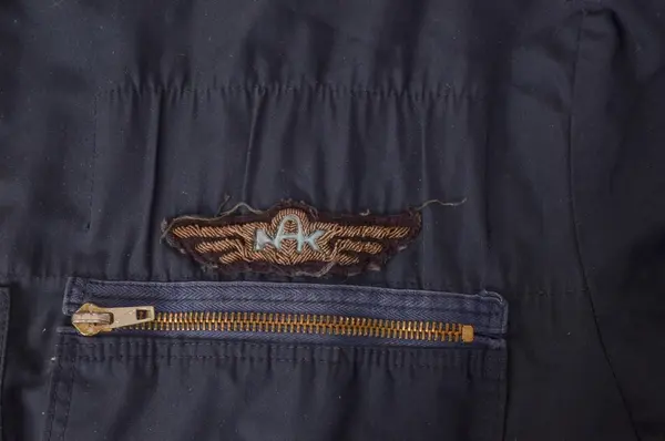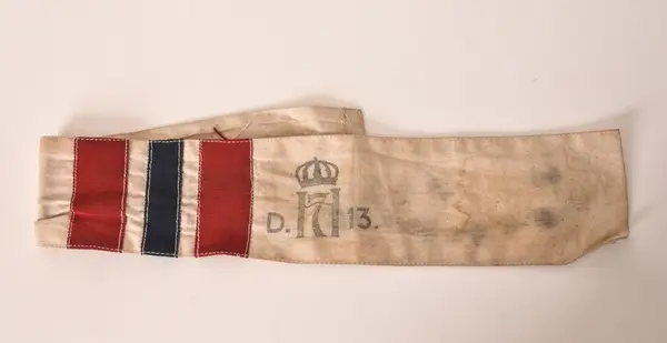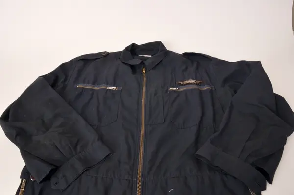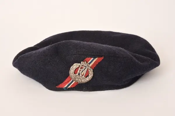 Motstandsmannen Bjørn Norlies blå kjeledress av samme type som ble brukt som uniform, armbind med norsk flagg merket "H7 D13", beret med H7 merke, halstørkle av fallskjermsilke med knyttet ring av fallskjermssnor og bandolær.