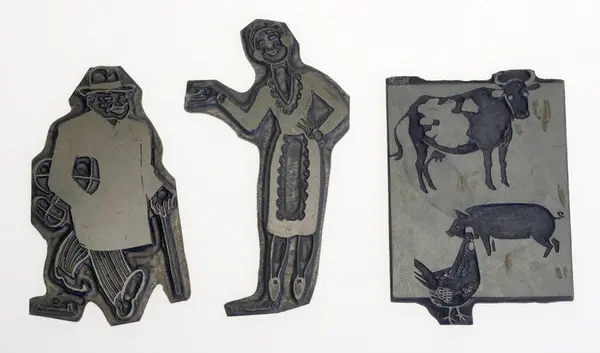 -3 stk. klisjeer som viser ulike dyr (rein, ku, gris, høne og sau).