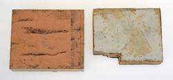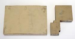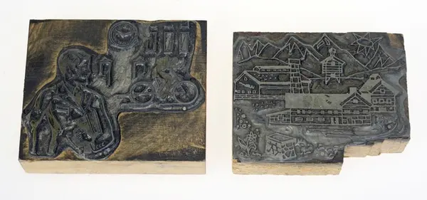 -2 stk. klisjeer som viser landskap med bebyggelse (en er montert på en trekloss).