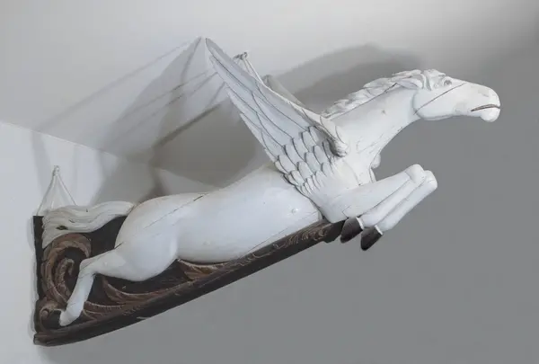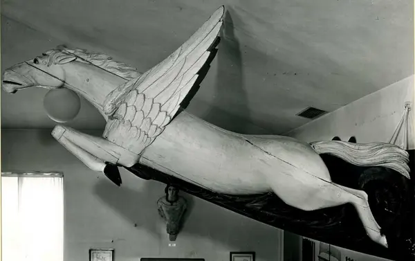 "Musernas älskling, den bevingade hästen Pegasus, var en passande galjonsbild på den norska fyrmastbarken. På ulltraden var hon en av de allra snabbaste. Ett dygn skall hon ha loggat 14 knop i snitt. Hon var byggd i järn i Liverpool år 1884 och mätte 2596 brutto registerton. Den 9 september strandade barkskeppet Pegasus vid Märkets fyr i Ålands hav. Hon var på väg från Sundsvall till Melbourne.