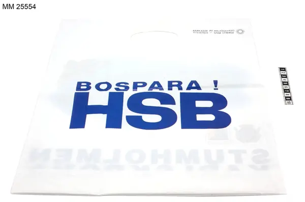 Bärkasse av vitfärgad polyeten. Rektangulär form med ett ovalt hål som handtag i den övre änden. I mitten står texten "BOSPARA! HSB" med blåa stora bokstäver. I det övre högra hörnet står texten "BÄRKASSE AV MILJÖVÄNLIG POLYETEN - SPAR ENERGI" i svart med en symbol som påminner om en sol bredvid. På andra sidan i nederkanten stå... Bärkasse av vitfärgad polyeten. Rektangulär form med ett ovalt hål som handtag i den övre änden. I mitten står texten "BOSPARA! HSB" med blåa stora bokstäver. I det övre högra hörnet står texten "BÄRKASSE AV MILJÖVÄNLIG POLYETEN - SPAR ENERGI" i svart med en symbol som påminner om en sol bredvid. På andra sidan i nederkanten står texten "STUMHOLMEN KARLSKRONA" i blåa stora bokstäver. Över denna text är den blå och beigeaktika loggan för HSB samt en fyrkantig blå och gul symbol för Bomässan 1993. Runt symbolen för mässan, som en ram, står en liten svart text "SVENSK BOSTADSMÄSSA", "SVENSK BOSTADSMÄSSA, KARLSKRONA", "SVENSK BOSTADSMÄSSA, KARLSKRONA" och "SVENSK BOSTADSMÄSSA 31 JULI - 22 AUGUSTI". Mitt på denna sidan av kassen finns en bild som föreställer ön Stumholmen omsluten av blått hav, på vilket det seglar tre segelbåtar. På bilden syns även bebyggelse som föreställer alla de kända byggnaderna på Stumholmen, som Marinmuseum, Slup- och barkasskjulet, Desinfektionshuset, Kronobageriet, Kronohäktet, Båtmanskasernen, Flyghangarerna, Kungshall och Kungshalls magasin. Mellan byggnaderna syns grönområden med gräs och träd. På bilden har även två fyrar, flera flaggstänger, bryggor och ett hopptorn avbildats. I den högra kanten finns också bron över till Trossö med samt en bit av denna ö.