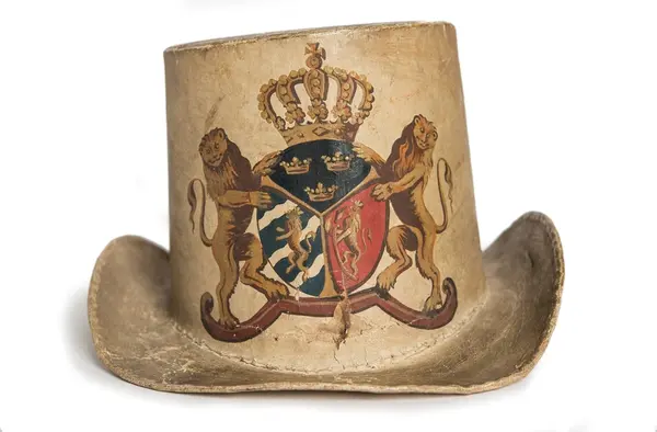 ”17502 a-h. Hattar. H 0,17 m. L m. brätten 0,305 m. Av vitlackerad pappersmassa, med vapen och lejon i brunt, gult, svart, blått och rött. Över pappersmassan är innan övermålningen å brättena grov väv spänd. Foder av bomull. Å några spår av rött ylleband 0,01 m. br. runt kullen.”