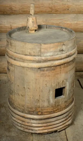 Mål: H 73, DI(utv)50. 5, H(innv)63, DI(innv)47 L(spuns)16. 5, L(topp)21. 3 Lagget "tønne" for oppbevaring av øl. Tønna har sylindrisk form og er satt sammen av 13 staver og holdes ...