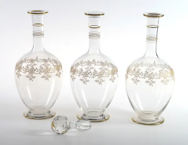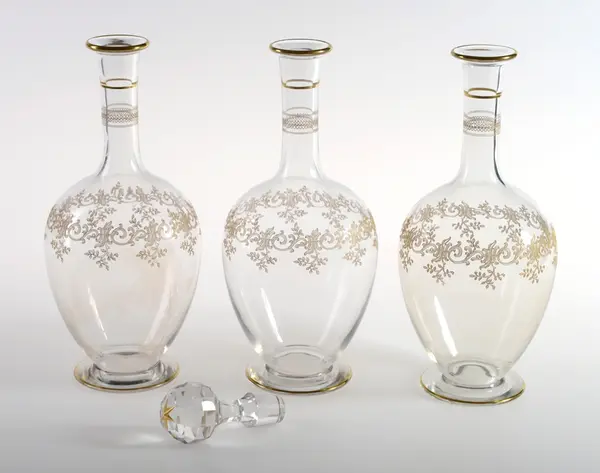 Bord av snirklende bladmønster i gull på øvre del av korpus, og to border på øvre og midtre del av hals. Den ene borden består av en smal gullstrek, den andre bestående av en slyngbord med to tynne gullstreken tett sammen over og under slyngborden. Rand og fot har også gullkant. Det er påført en gullfarget stjerne på toppen av korken.