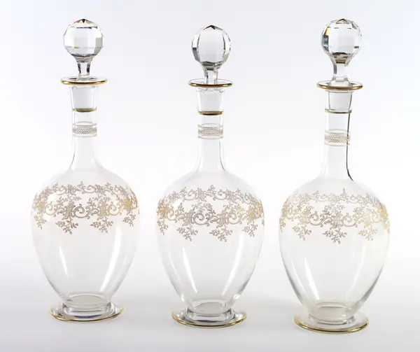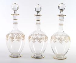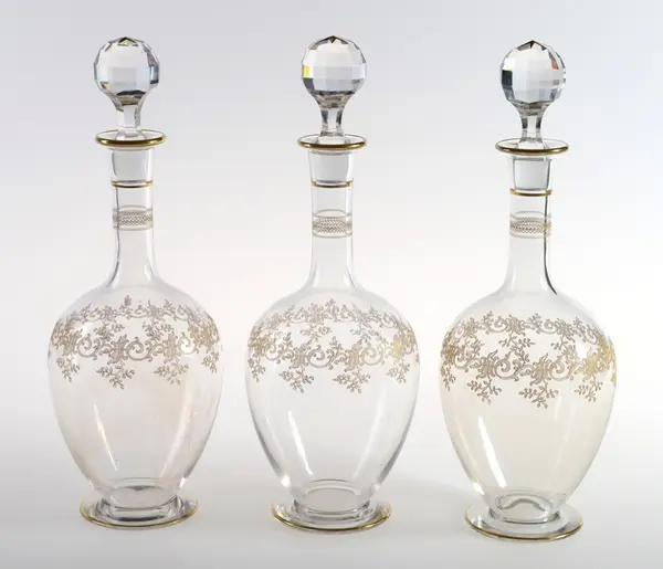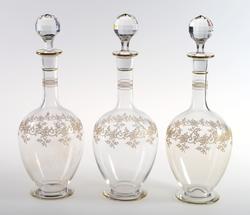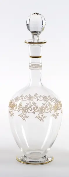 about Korpus med skrå skuldre og smal bunn. Halsen er halvlang og smal, med en utkraget rand uten nebb. Korken er kuleformet med slipte fasetter, og en kort innsvinget hals.