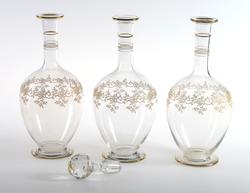 Subject Bord av snirklende bladmønster i gull på øvre del av korpus, og to border på øvre og midtre del av hals. Den ene borden består av en smal gullstrek, den andre bestående av en slyngbord med to tynne gullstreken tett sammen over og under slyngborden. Rand og fot har også gullkant. Det er påført en gullfarget stjerne på toppen av korken.