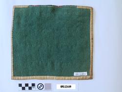 • Bringeklut med ullbroderi i smøyg i fargane raudt, grønt og gult. Smale metallborder innimellom broderiet. Rosete silkeband oppe i grønt, gult og to raud/lilla fargar. montert på kvitt bomullsstoff som no er veldig gulna og flekkete. Bakstykket er i grønt vadmål.