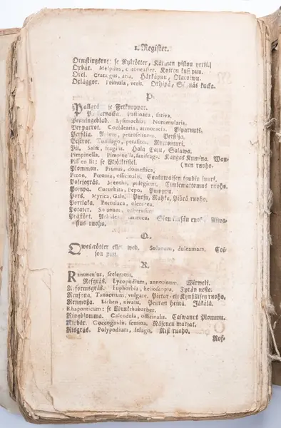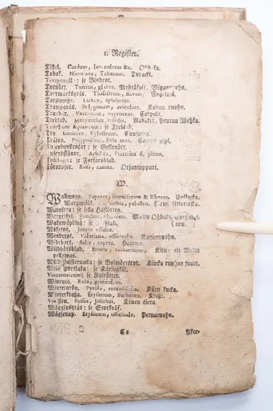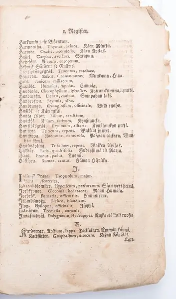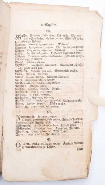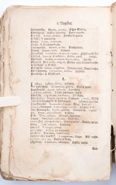 I registret på Recepter beskrivs bl.a. följande botemedel: hundloka, isop, jungfrustvål, lilla skörbjuggsgräs, renmossa, tobak, tranbär, ålandsrot, ärenpris, ögontröst.