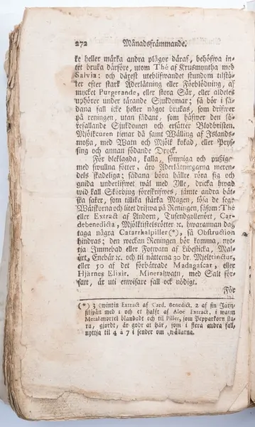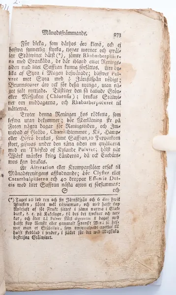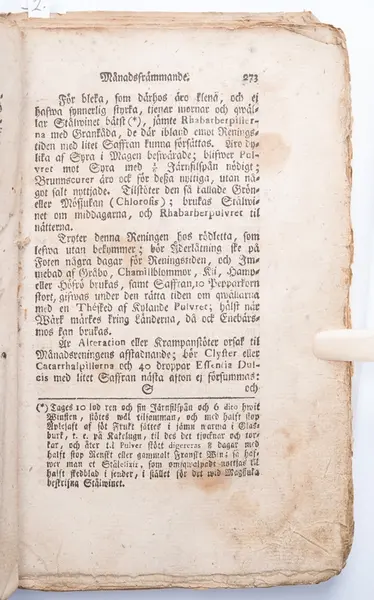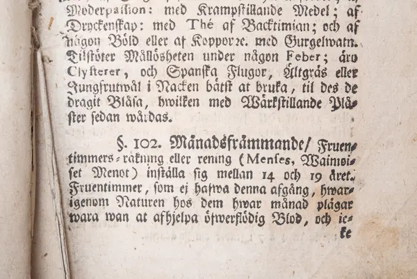 Under Beskrivning av sjukdomar på paragraf 102, sidan 271 beskrivs Månadsfrämmande [menstruation] och Käringebadden [klimakterium], med tips på bot vilka varierar beroende på hårfärg, liksom olika bot för fruntimmer mellan 43 á 50 med så kallade Käringebadden eller Phlogoses (grek. burning, inflammation), se avfotograferade sidor.