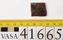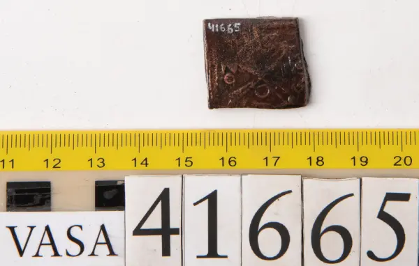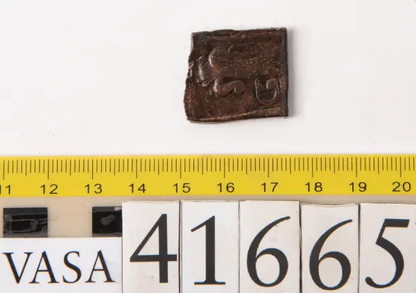 Text in English: Square-shaped coin. Denomination: ½ - öre.